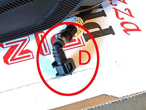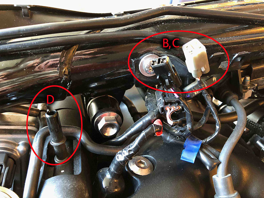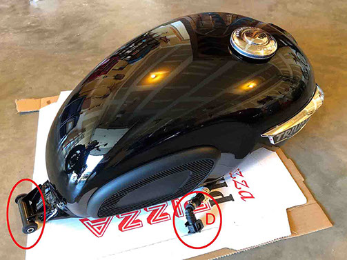 I won’t go into a lot of step-by-step detail here as there are plenty of resources (YouTube, etc.) to show you how to remove the gas tank. Additionally, the T120 service manual instructs you to initially disconnect the battery (ground first). Probably a good suggestion when working with a part of the bike that contains fuel and electrical connections. My gas tank was full, so I did siphon all the gas (or as much as possible) from the tank. Also, make sure the key is removed from the ignition during all these steps. Basically, you remove the seat; then undo and remove the bolt at the back of the tank (See Step 1E for bolt location). Lift the back of tank up approx. 3-6” to allow access under the tank. Pull breather hose away from (2) clips located on the underside of the fuel tank on the bottom edge (LH side), then pull the breather hose completely off of the bottom of the tank (LH side near front) - (Pic Highlight A). Undo the electrical connections for the fuel pump and fuel level sensor under the tank (RH side) – (Pic Highlight B and C). Undo and pull up the fuel hose (RH side) from the fuel rail – To do this, pull back on the locking tab, push buttons on each side (inner and outer) and at the same time wiggle the connector up (Pic Highlight D). Some fuel will leak out of the hose, although the tank will not empty onto the floor as the opening at the bottom of the tank is “self-sealing”. Lifting the tank up at the back (near area where the fixing bolt was removed), hold tank (completely so that you can safely carry it once removed) and slowly and carefully pull backwards to remove tank. Set the tank on a piece of cardboard on the floor or workbench.