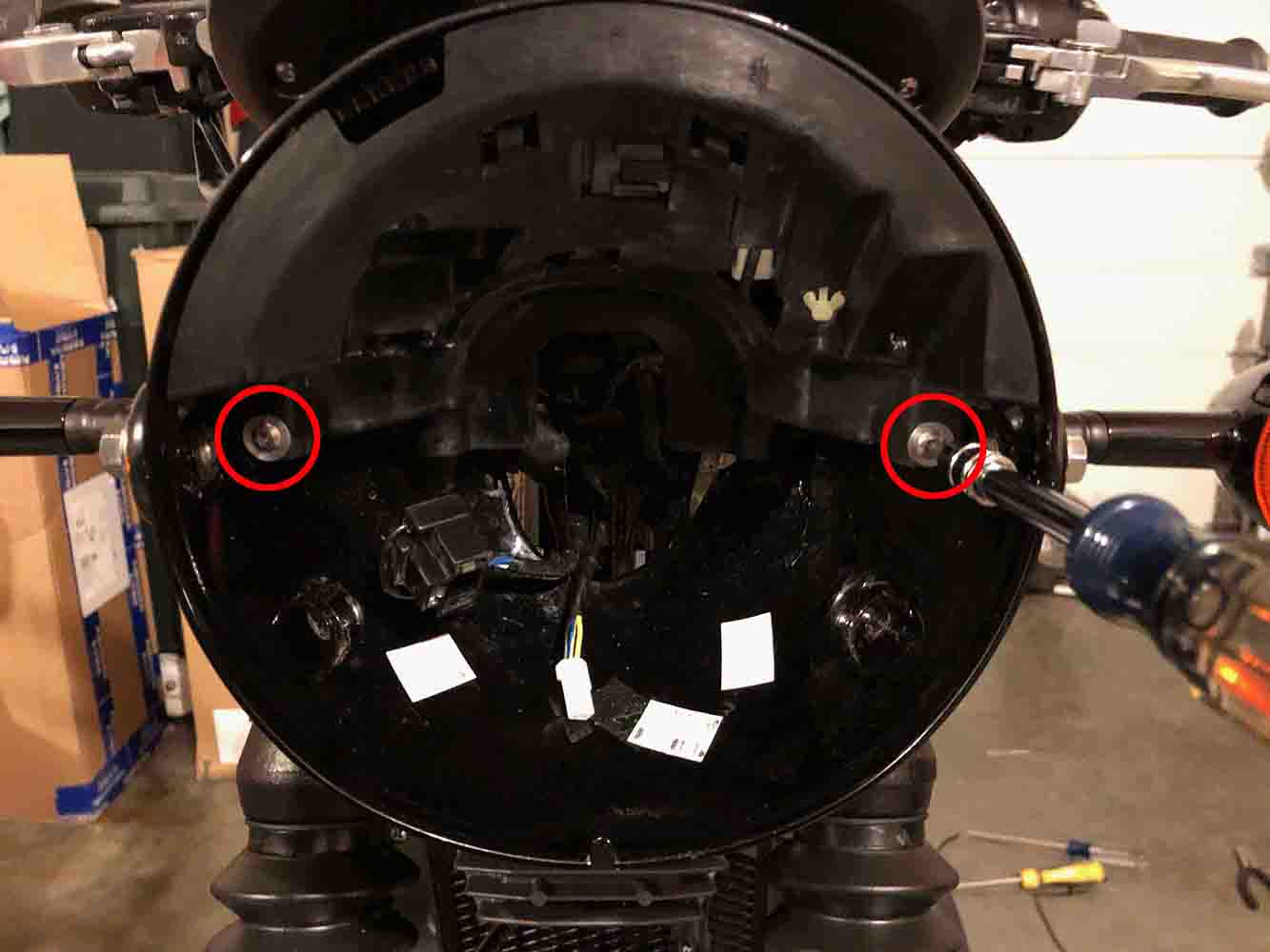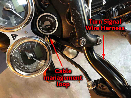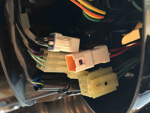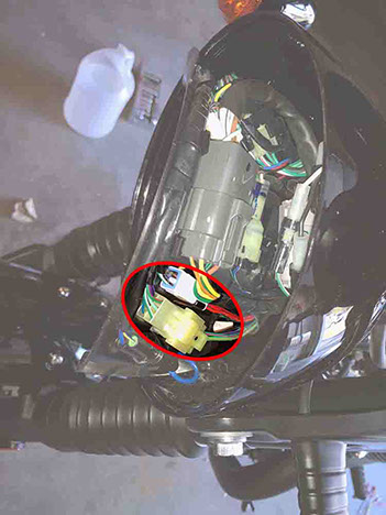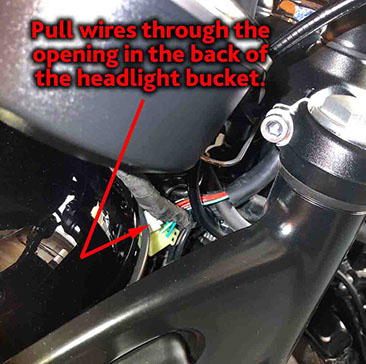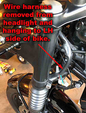 Locate the (2) turn signal connectors inside the headlight bucket (coming from the turn signal switch) as shown in the first picture (and highlighted in the previous step). Disconnect these (2) connectors. Note how the turn signal wire harness is routed from the LH grip so that you can reassemble using the same path (Take before pictures with your smartphone/camera before disassembling) . Carefully pull the turn signal wire harness through the opening in the back of the headlight bucket and allow it to hang from the LH grip on the LH side of the bike (as shown).