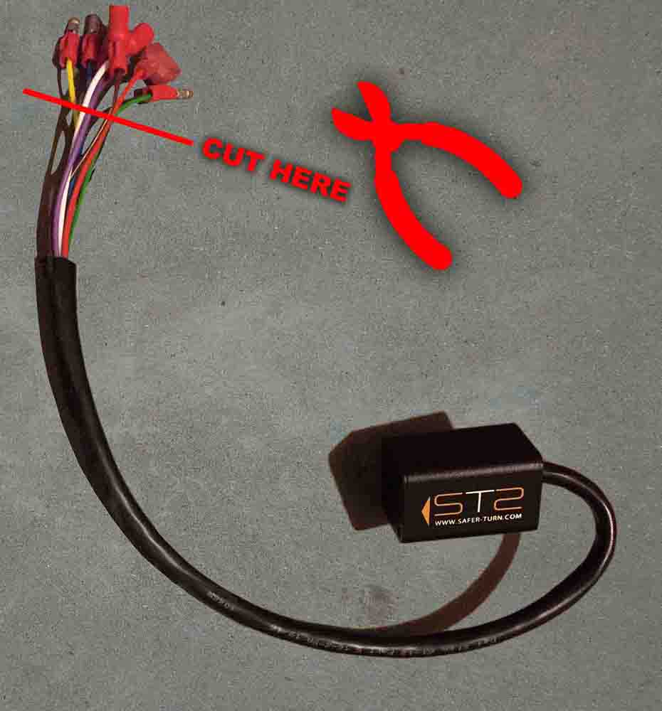 Completely remove the black outer sheath from the entire length of the 36” extension cable (obtained from STS or reseller like A&J Cycle): Starting at the end of the black outer sheath where the wires exit - Use a sharp wire cutter and carefully run the jaw of the cutter along the inside of the black outer sheath, so that the sharp cutting jaw is facing out and the smooth rounded side of the cutter slides harmlessly along the wires inside. Go slowly and be very careful – If any wires are nicked you will need to replace this extension cable. The black outer sheath on mine was quite thick. Push away from yourself and take your time. You can also pull on the jacket to tear it open once you get a cut started. This will step is required to reduce the diameter of this cable and also allow you to eliminate the RED and BLACK wires from inside this extension cable in a later step. (Note: These RED and BLACK wires are no longer needed as the power/ground connections will be made under the seat – However, save these wires for use later to make wire leads.) Eliminating the black outer sheath will also make this extension more flexible which will make it easier to route under the tank and into the headlight assembly.