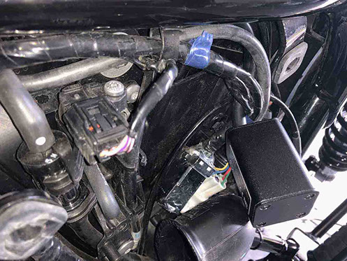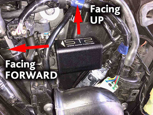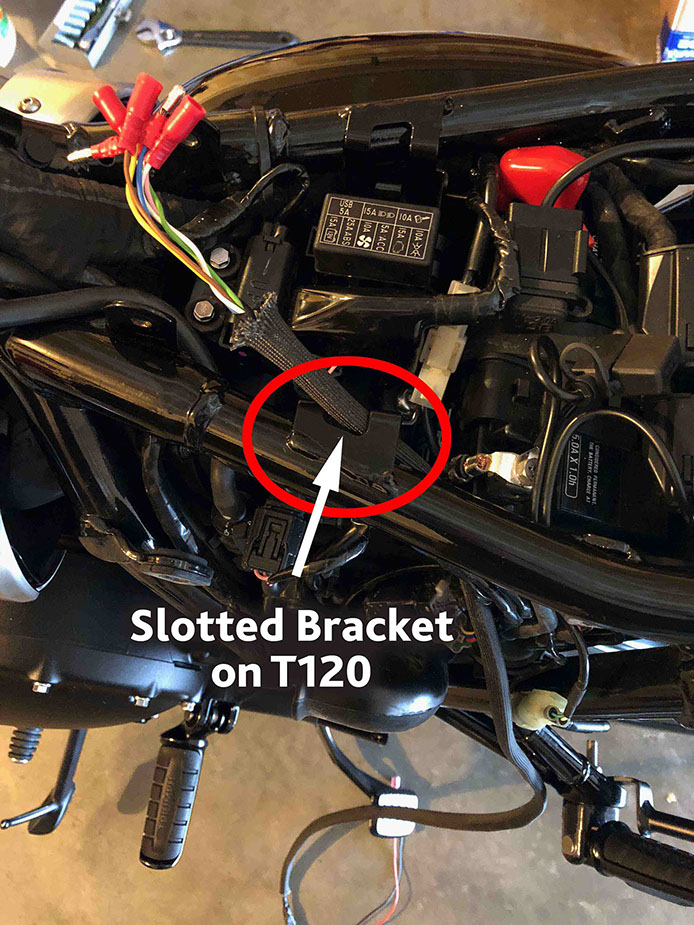 Route the wire assembly up through the space on the LH side of the bike (under the side cover) where the STS unit will be mounted. Pass wires up through the slotted bracket (under the seat) as shown. (Note: This slot will help manage the cables and keep them securely located in position.) Continue to pull the wires up through this slot (including the BLACK ground and the RED 12v+ power lead) until the STS unit is located in the area under the side cover as shown. Gently form the wire bundle on the STS unit into a large “C” shape so that the arrow on the STS unit can be facing forward with the STS logo facing UP and the STS unit is sitting basically level. The wire housing exits the back of the STS unit and curls up to the slotted bracket behind the existing T120 wiring. (Note: We will “permanently” mount the STS unit here later using cable ties and/or heat resistant double-sided tape.)