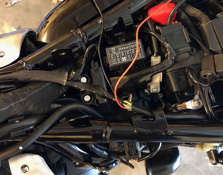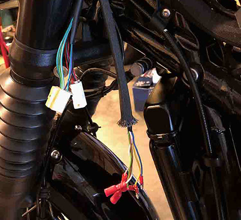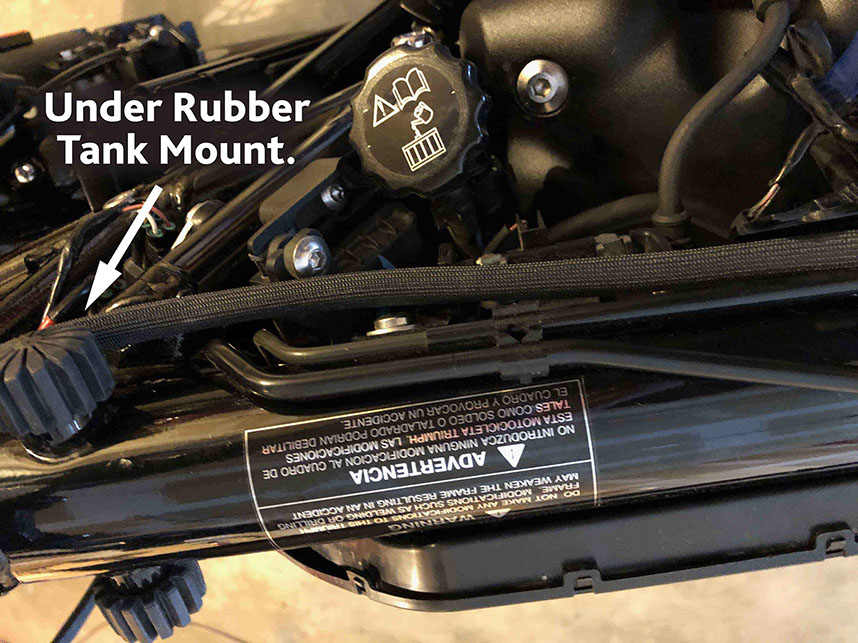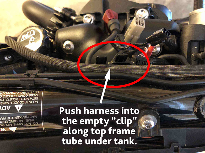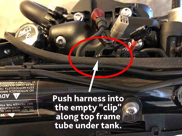 Clip the heat shielded wire bundle in the empty bracket under the back of the tank (near the electrical connectors) as shown. Then to route the heat shielded wire bundle up along the frame. Finally, route the heat shielded wire bundle up under the RH side rubber front tank mount and around the front of the head tube back to the LH side of the bike where the turn signal wire harness is hanging (see Step 4).