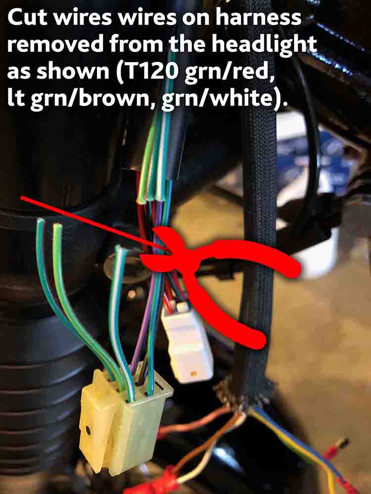 Locate the larger turn signal connector (removed from the headlight in a previous step and now hanging down the LH side of the bike). ONLY cut the (3) wires as shown (2016 Triumph T120: grn/red, lt grn/brown, grn/white) approx. 2-3” from the connector. DO NOT CUT THE OTHER 3 WIRES GOING TO THIS CONNECTOR! Note: To make it easier to access these wires you might need to cut the outer plastic wire harness sleeve 2”-3” and pull it back.