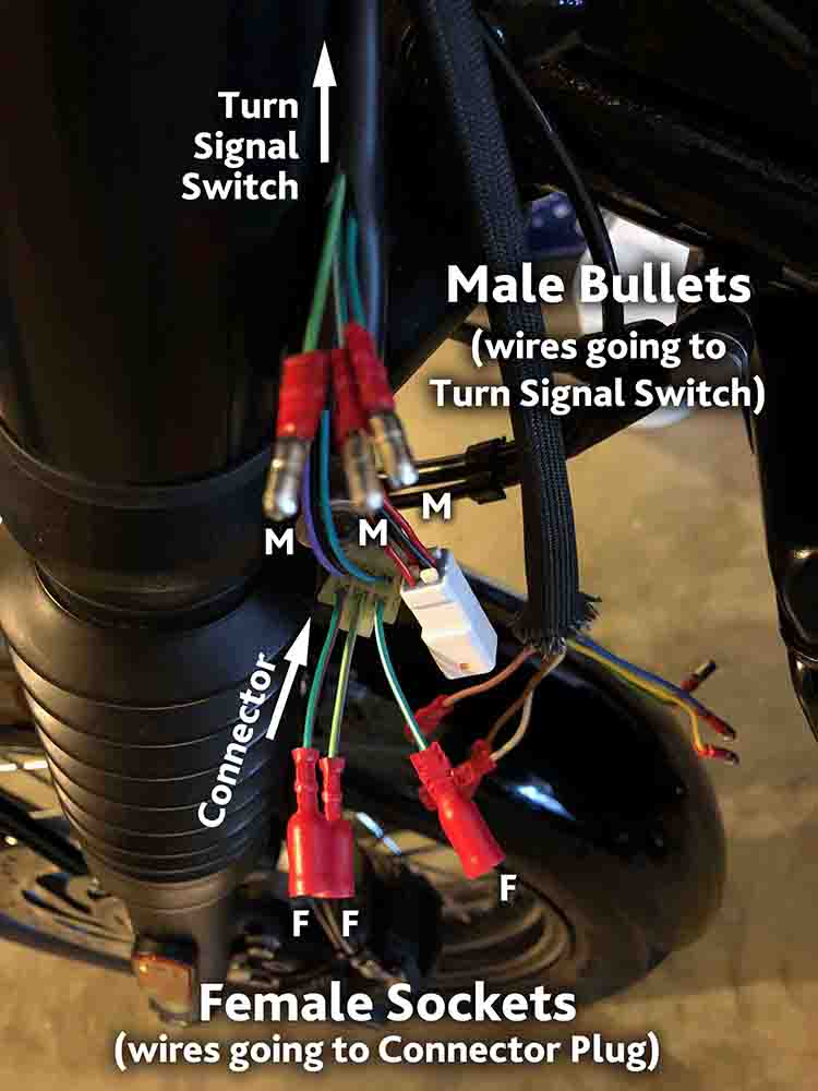 Strip the ends of the (3) wires going to the Turn Signal Switch approx. ¼” and crimp on the 22ga Male Bullet connectors. Strip the ends of the (3) wires going to the Connector Plug approx. ¼” and crimp on the 22ga Female Socket connectors. See photo below for details. Take your time and make sure you have solid crimped connections.