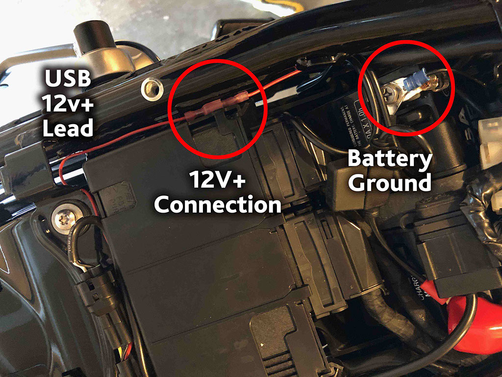 Route the 17” BLACK ground wire from the STS harness assembly back to the battery ground. Unscrew the battery ground from the battery. Slip the ground ring over the battery ground screw. Tighten the battery ground screw to secure the ground wire. (IMPORTANT! Check to make sure your key is removed from the ignition before continuing to connect the 12V+ power leads.) Route the 17” RED 12V+ power lead coming from the STS harness assembly back to the 12V+ power lead coming from the (yellow) USB wire tap. Plug the female connector coming from the STS harness into the male connector coming from the USB 12V+ wire tap. Tuck the 12V+ and ground wires down into the area under the seat so that they do not get pinched when the seat is re-attached.