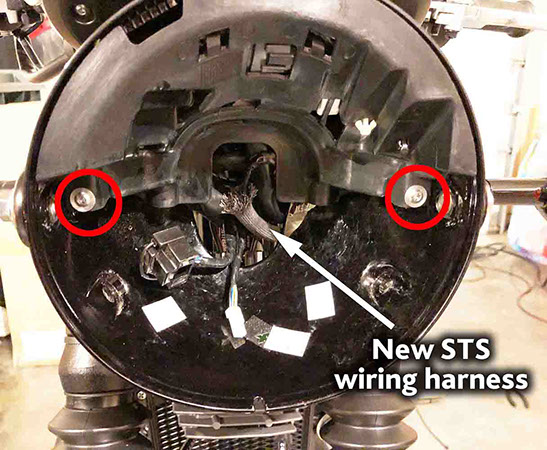 Re-check the wire harness path by turning the handlebars right and then left to make sure the original turn signal harness and the STS harness still do not get pinched – If necessary, remove the screws that hold the plastic plate and re-adjust or re-route the wiring harnesses as needed.