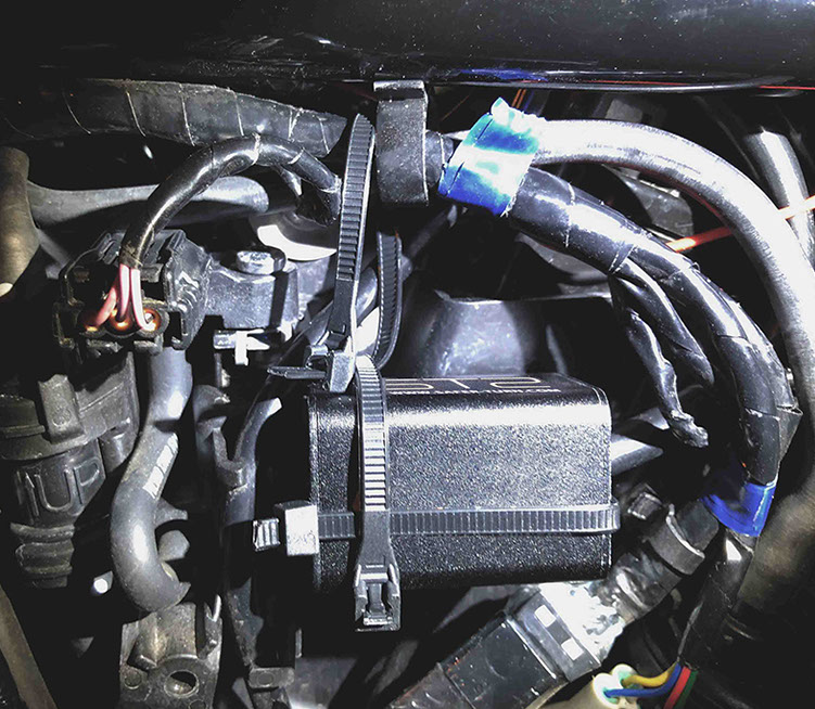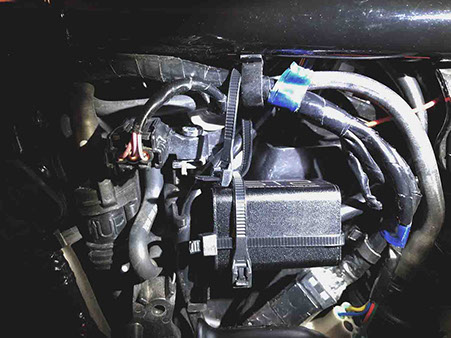 Using (heavy duty) zip ties – Secure the STS unit to the bike under the LH Side Cover. I used (3) and even made use of a hole in the plastic housing on the bike at the front of the STS unit to help secure it. In addition to the zip-ties, you can also use automotive double-side adhesive tape (Click here to purchase from Amazon.com) and place a small square of tape on the back between the STS unit and the bike, but I would not rely on tape by itself (without zip-ties) to hold the STS unit securely in place.